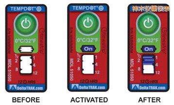 TempDot™Plus標(biāo)簽應(yīng)存儲(chǔ)在室溫下,并必須在反應(yīng)溫度閾值以上被激活。激活是通過(guò)用手指推壓。"On"字出現(xiàn)在第一個(gè)窗口中顯示激活。之后5分 鐘內(nèi),在反應(yīng)溫度或低于反應(yīng)溫度的情況下將標(biāo)簽貼到產(chǎn)品上。藍(lán)色染料熔化并以控制的速率遷移,經(jīng)過(guò)白色大窗口。這表示暴露在溫度閾值以上的累計(jì)時(shí)間。當(dāng)溫 度低于閾值時(shí),,該染料固化并停止移動(dòng)。如果溫度超過(guò)閾值,TempDot®Plus標(biāo)簽提供即時(shí)的視覺(jué)跡象。